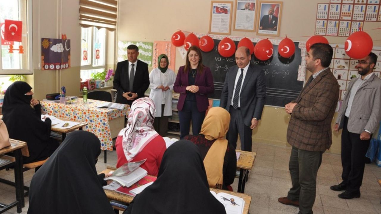 Daha sonra Seyitler Mahallesi'nde bulunan Sabri Ülker İlkokuluna giderek, burada 'Okuryazarlık Seferberliği' kapsamında devam eden kursları ziyaret edip okulun müdürü Salih İnançlı ve öğretmenlerden bilgi alan Çetin ve Kurtaran, kursiyerlerle bir süre sohbet etti.