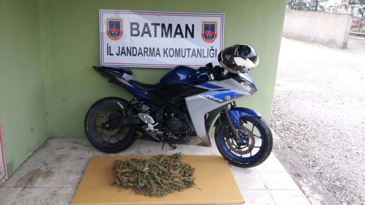 Valilikten konuyla ilgili yapılan açıklamada, Batman İl Jandarma Komutanlığı ekiplerince Batman - Kozluk Karayolu üzerinde icra edilen yol emniyet ve kontrol çalışmalarında, şüpheli bir motosiklet ve iki şahıs üzerinde yapılan aramada, toplam bin 800 gram kenevir bitkisi ele geçirildiği belirtildi.