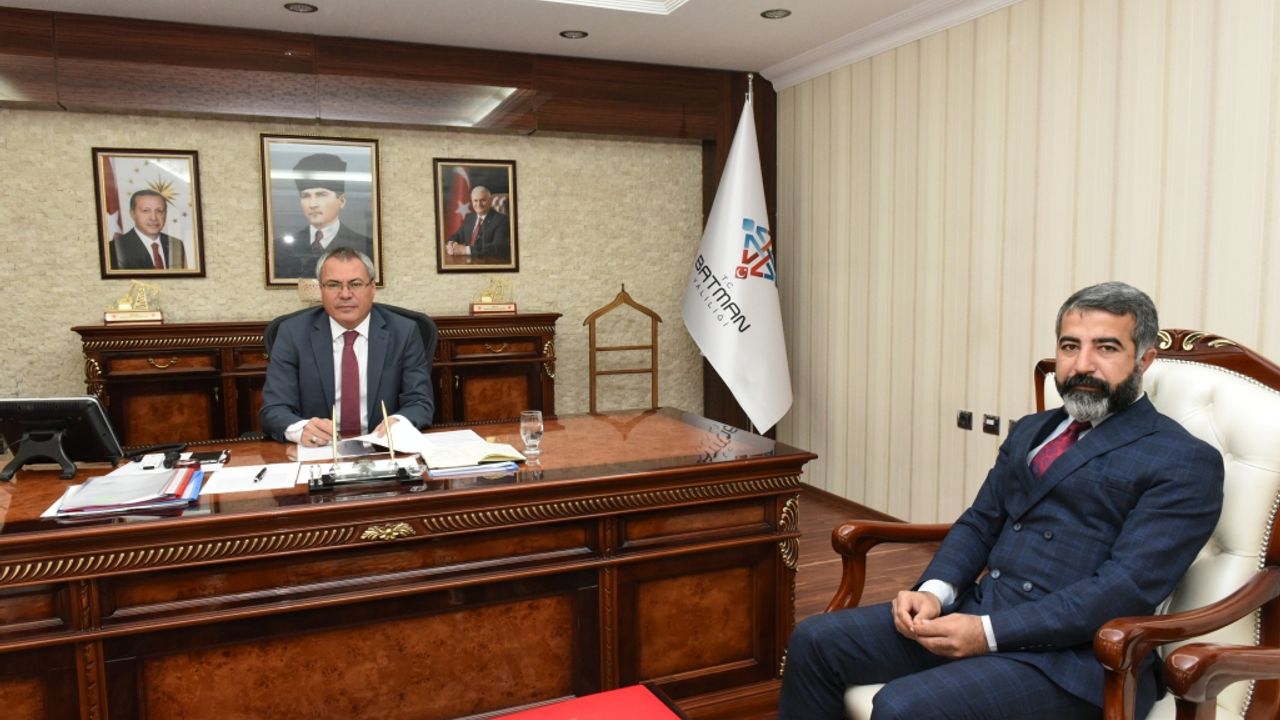 Türk Kızılayı Batman Şubesi Başkanı Ali Tezdiğ Vali Ahmet Deniz'i makamında ziyaret ederek, yapılacak okul hakkında bilgi verdi.
