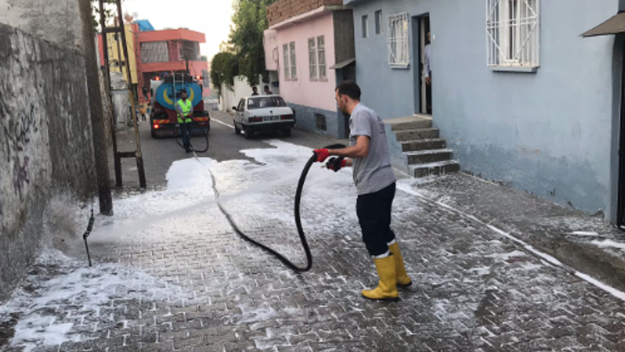 Başkan Vekili Aksoy'un talimatları doğrultusunda harekete geçen Belediye Temizlik İşleri Müdürlüğü ekipleri, İluh Mahallesi'nde cadde, sokak ve kaldırımları köşe bucak köpüklü su ile yıkayarak dezenfekte etti.