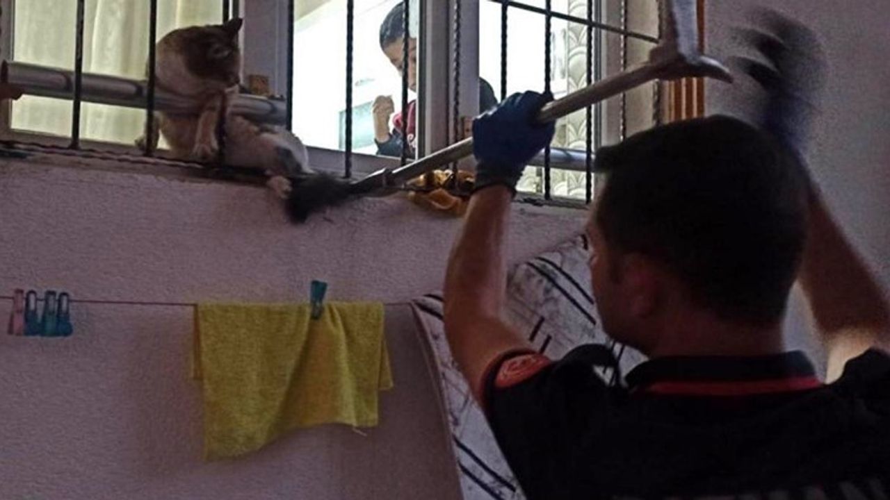 itfaiye ekipleri, demir kesme makasıyla kediyi sıkıştığı yerden kurtardı. Yemek