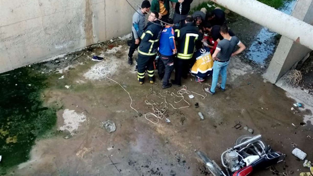 düşen yaralı motosiklet sürücüsünü kanaldan sedye üzerinden çıkardı.