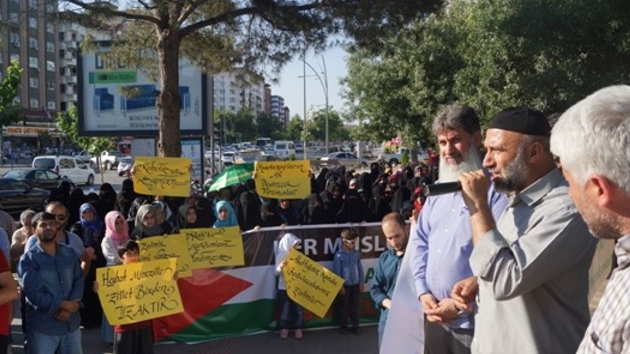 'Müslümanlar birlik olmadan katliamlar bitmez', 'Katil İsrail Filistin'den defol', 'Akıttığınız kanda boğulacaksınız ey zalimler', ve 'Yüreğimizdesin Ey Mescid-i Aksa' gibi afişlerin açıldığı basın açıklaması sırasında katılımcılar sık sık tekbir getirerek, 'Müslüman uyuma küfre karşı birlik ol' ve 'Zalimler için yaşasın cehennem' sloganları attı.