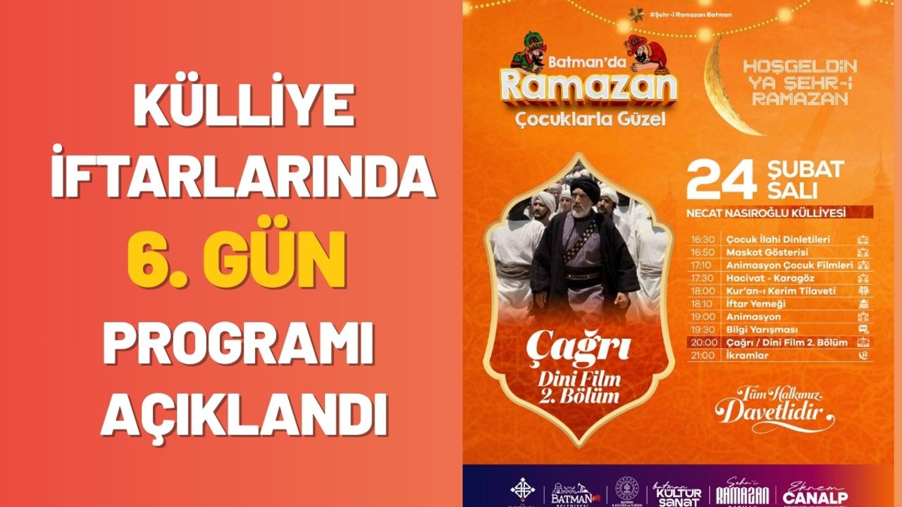 Yetkililer tarafından paylaşılan bilgilere göre, 24 Şubat Salı (bugün) düzenlenecek olan 6. gün programında hem çocuklara hem de yetişkinlere yönelik çeşitli etkinlikler yer alacak. İftar öncesi çocuklara yönelik sahne gösterileri ve animasyon filmleriyle başlayacak olan program, iftarın ardından bilgi yarışması ve sinema gösterimiyle devam edecek. Saat 20:00'de ise İslam tarihini konu alan dini film "Çağrı"nın ikinci bölümünün gösterimi yapılacak.