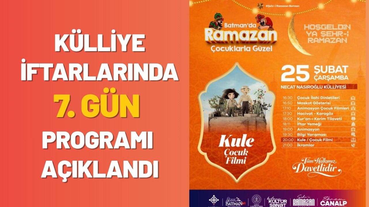 Yetkililer tarafından paylaşılan bilgilere göre, 25 Şubat Çarşamba (bugün) düzenlenecek olan 7. gün programında ağırlıklı olarak çocuklara yönelik etkinlikler yer alacak. İftar öncesi çocuk ilahi dinletileri, maskot ve Hacivat-Karagöz gösterileriyle başlayacak olan program, iftarın ardından animasyon ve bilgi yarışmasıyla sürecek. Saat 20:00'de ise "Kule" isimli çocuk filminin gösterimi yapılacak.