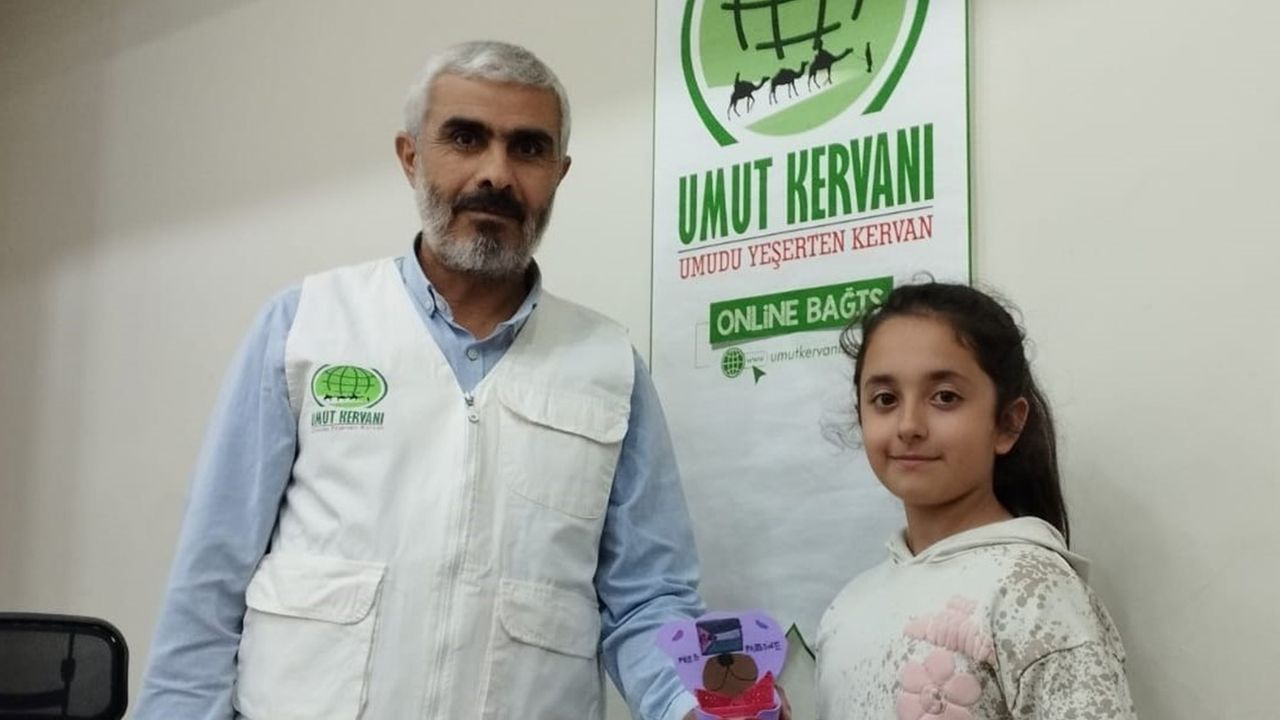 Umut Kervanı yetkililerinden Fuat Ayaş, bağış kampanyasına destek veren minik Eslem Su Yücel ve ailesine teşekkür etti. (İLKHA)