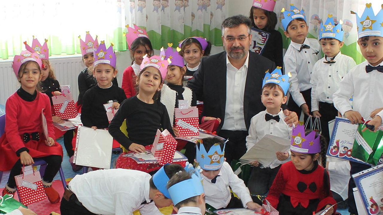 tarafından çocuklara taçları takılarak ilk dönem karneleri ve çeşitli hediyeler