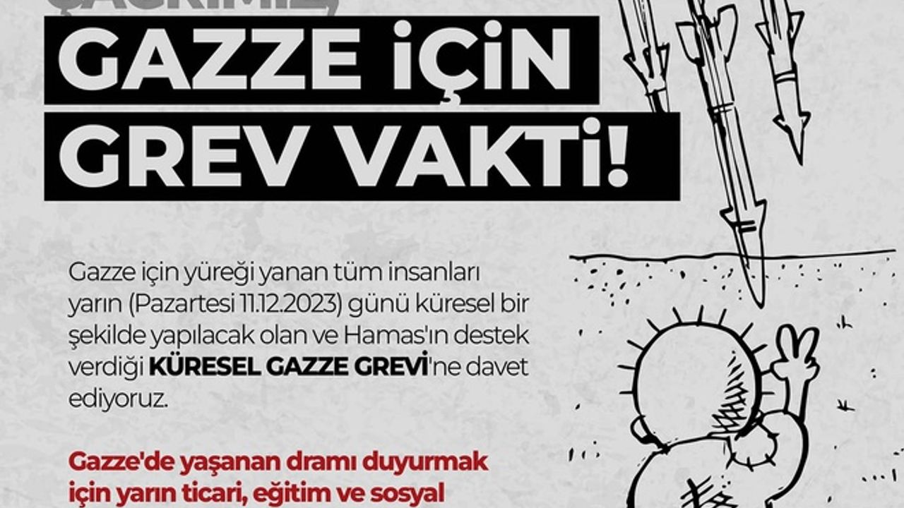 Paylaşımında İTTİHADUL ULEMA, "Gazze için yüreği yanan tüm insanları pazartesi (yarın) küresel bir şekilde yapılacak olan ve HAMAS'ın destek verdiği 'Küresel Gazze Grevi'ne davet ediyoruz. Gazze'de yaşanan dramı duyurmak için yarın ticari, eğitim ve sosyal hayatımızı durduruyoruz." çağrısında bulundu.