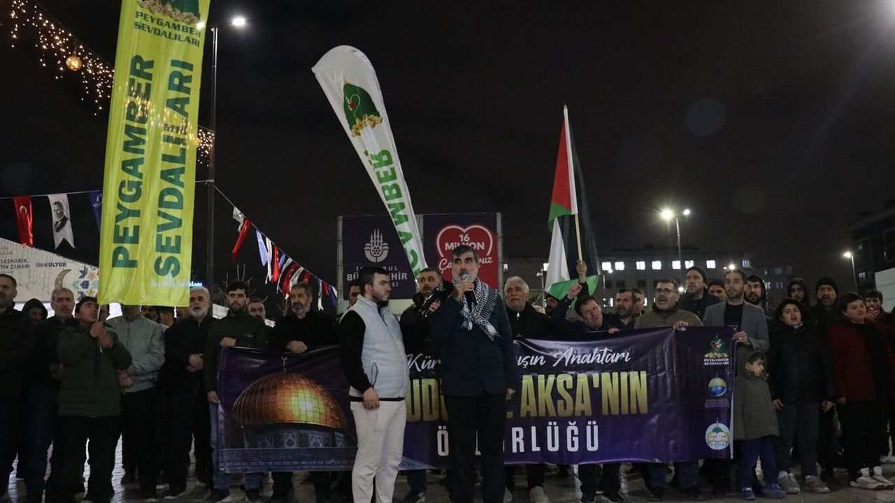 Peygamber Sevdalıları tarafından hazırlanan basın açıklamasını okuyan Yusuf İpek, 'Kudüs, yalnızca Filistin halkının değil, bütün Müslümanların ve bütün insanlığın ortak mirasıdır. Mescid-i Aksa ise Müslümanların ilk kıblesi ve mukaddes mabetlerinden biridir. Ancak bugün Kudüs, Mescid-i Aksa ve Gazze; Siyonist işgal rejiminin sistematik saldırıları ve yayılmacı politikaları altında ağır bir kuşatma yaşamaktadır. İsrailin Gazze'de başlattığı ve bugün Lübnan'a, Suriye'ye, Yemen'e ve İran'a yaydığı çatışma süreci, asla bir güvenlik meselesi değildir. Bu, 'Arz-ı Mev'ud' hezeyanıyla bölge ülkelerini zayıflatma, parçalama ve köleleştirme operasyonudur. Siyonist akıl, kendi güvenliğini komşu ülkelerin yıkımında aramakta, attığı her adımda dünya barışının altına dinamit döşemektedir. Bu saldırganlık, 'israilin güvenliği' bahanesi altında bütün bölgeyi dizayn etmeyi hedefleyen emperyal bir projeye dönüşmüş ve dünya barışını doğrudan tehdit eden bir boyuta ulaşmıştır. Şurası açıktır ki mesele sadece Filistin meselesi değildir. Asıl mesele İslam coğrafyasının tüm direniş hatlarını kırmayı hedeflemektedir. Bugün Ortadoğu, modern dünyanın gözleri önünde sistematik bir yok etme operasyonuna sahne olmaktadır. Sadece sınırların değil, vicdanların da tarumar edildiği bu süreçte, Gazze ve Kudüs'e sahip olma adına Lübnan, Suriye, Yemen ve İran, küresel şer odaklarının hedef tahtasına oturtulmuştur.' dedi.