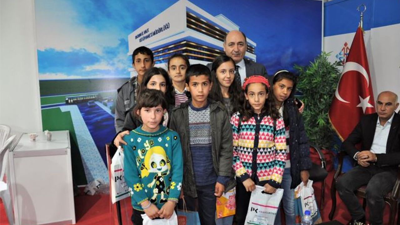 Eğitim Müdürü Mahmut Kurtaran, fuara gelen öğrencilerle ve onlara refakat eden