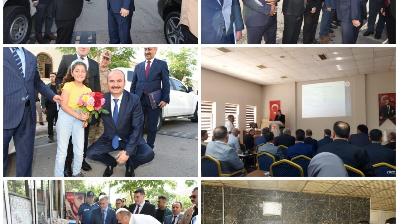 Vali Ekrem Canalp, İlçe Öğretmenevi bahçesinde Kaymakam Server Sinanoğlu ve Kurum Amirleri tarafından karşılandı. Karşılama sonrasında konferans salonunda Kaymakam Server Sinanoglu, yürütülen çalışmalar hakkında sunum yaptı.