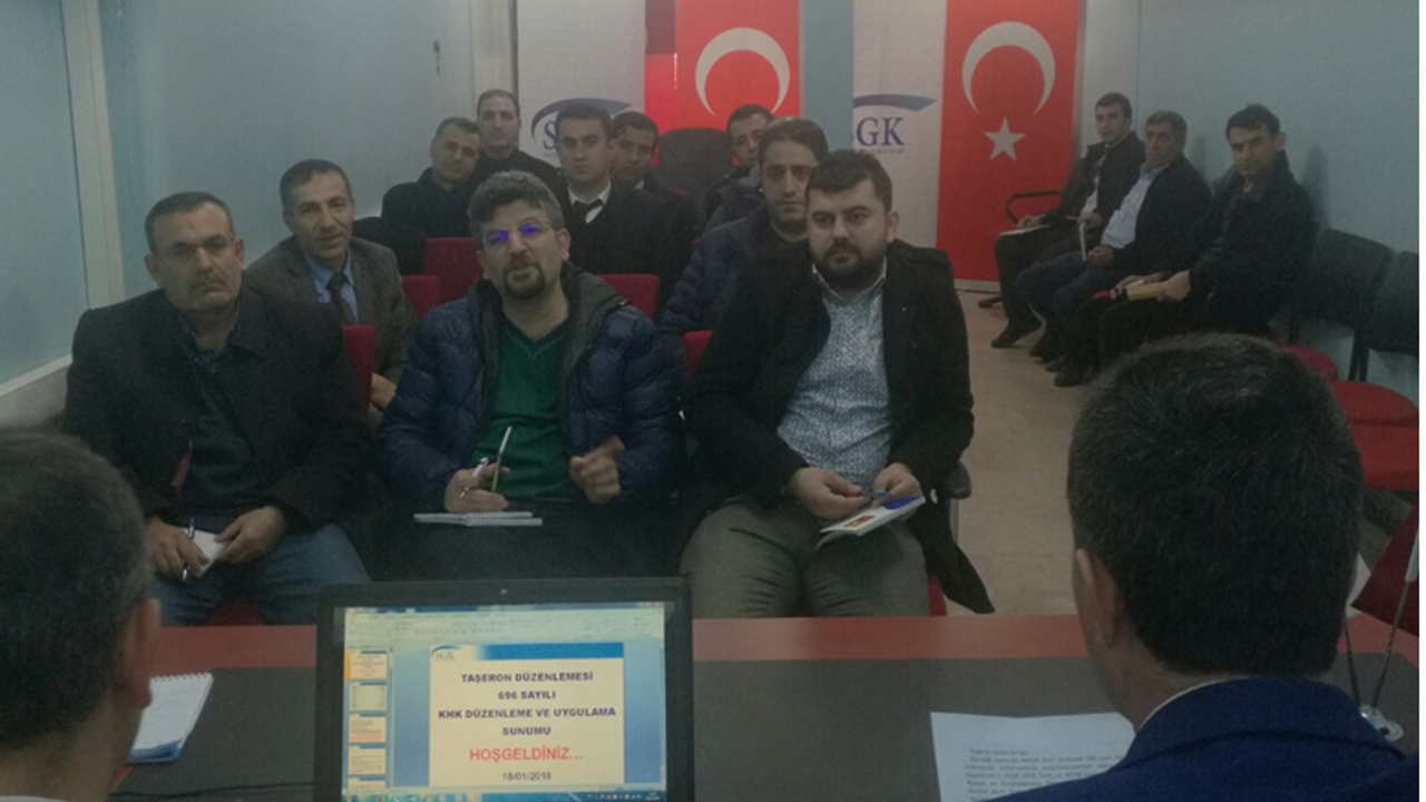 SGK İl Müdürlüğü tarafından eğitimle ilgili yapılan açıklamada, ' 24 ARALIK 2017 tarihinde 696 sayılı Kanun Hükmünde Kararnamenin yayınlanmasından sonra Resmi Gazete'nin 1 OCAK 2018 Tarih ve 30288 Sayısında; 'Kamu Kurum ve Kuruluşlarında Personel Çalıştırılmasına Dayalı Hizmet Alımı Sözleşmeleri Kapsamında Çalıştırılmakta Olan İşçilerin, Sürekli İşçi Kadrolarına veya Mahalli İdare Şirketlerinde İşçi Statüsüne Geçirilmesine İlişkin 375 Sayılı Kanun Hükmünde Kararnamenin Geçici 23 ve Geçici 24'üncü Maddelerinin Uygulanmasına Dair Usul ve Esasları' doğrultusunda İl Müdürlüğümüzde; tüm kamu kurum ve belediye yetkililerine EKAP eğitim sunumu gerçekleştirildi.Katılımcılar; kendilerine yapılan başvuruların değerlendirilmesine yönelik tespit komisyonunun EKAP üzerinden kayıtların nasıl incelenmesi ve kayıt oluşturulması gerektiği konusunda bilgilendirildi.' ifadeleri kullanıldı.