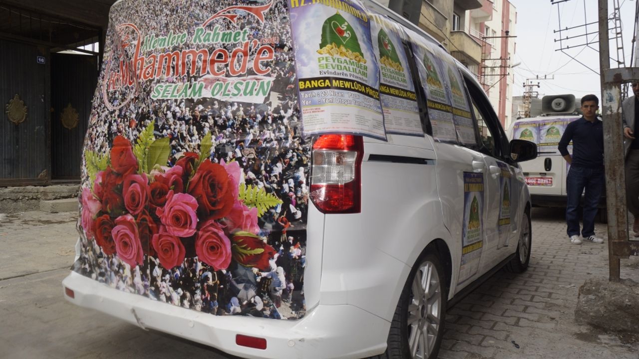 Batman Hira-Der önünden kalkan araçların üzerine 'Alemlere rahmet Hz. Muhammed`e (sav) selamlar olsun, Vahdet ve Kardeşlik Rehberi Hz. Muhammed (sav) ve 24 Nisan Pazar saat 13.30 mevlüd alanı' yazan brandalar asıldı.