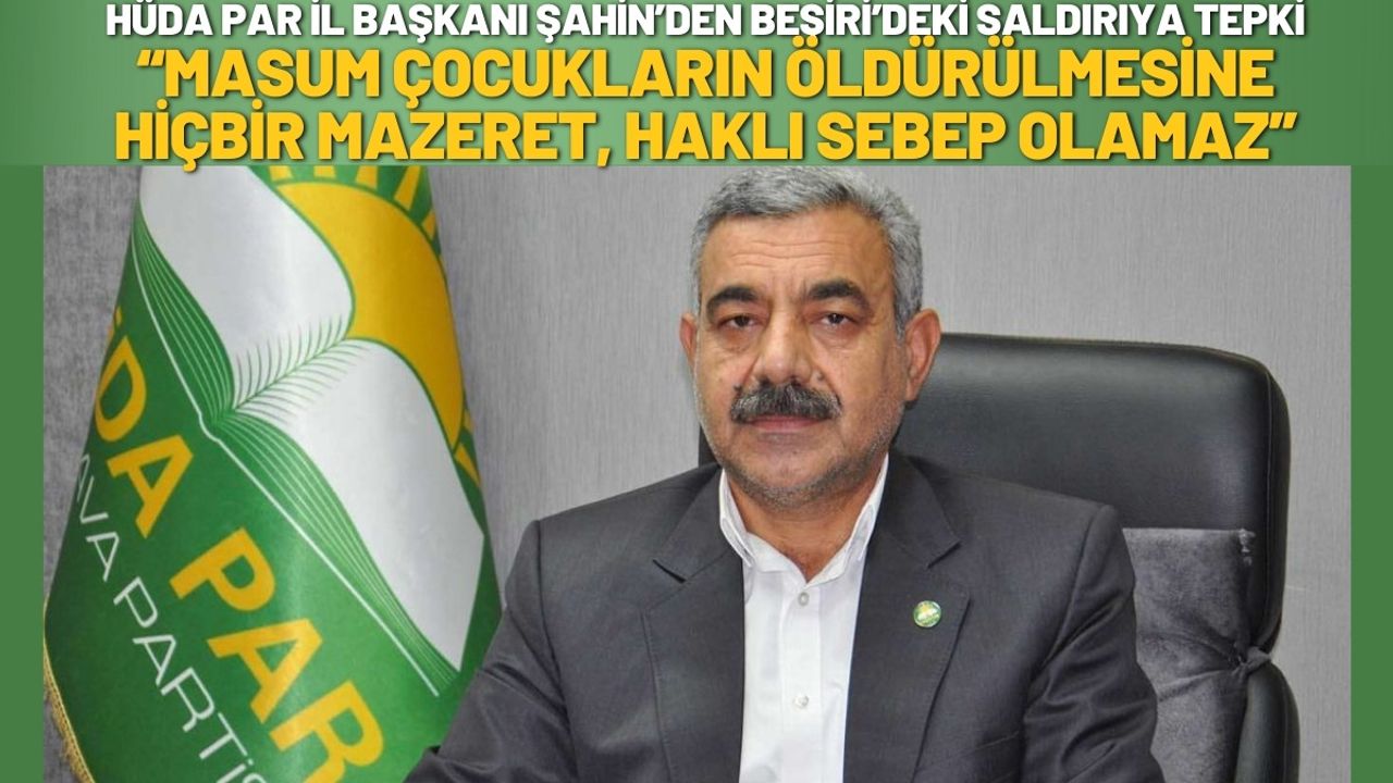 HÜDA PAR Batman İl Başkanı Davut Şahin, Beşiri ilçesi Eskihamur (Newalê) köyünde aynı aileden baba, anne ve iki çocuğun öldürülmesine ilişkin açıklamada bulundu. Şahin, “Dün gece Beşiri İlçemizin Eskihamur/Newalê köyünde aynı aileden baba, anne ve iki çocuklarının öldürülmesi olayı bizi derinden üzmüştür. Özellikle masum çocukların öldürülmesine hiçbir mazeret, haklı sebep olamaz.” ifadelerini kullandı.