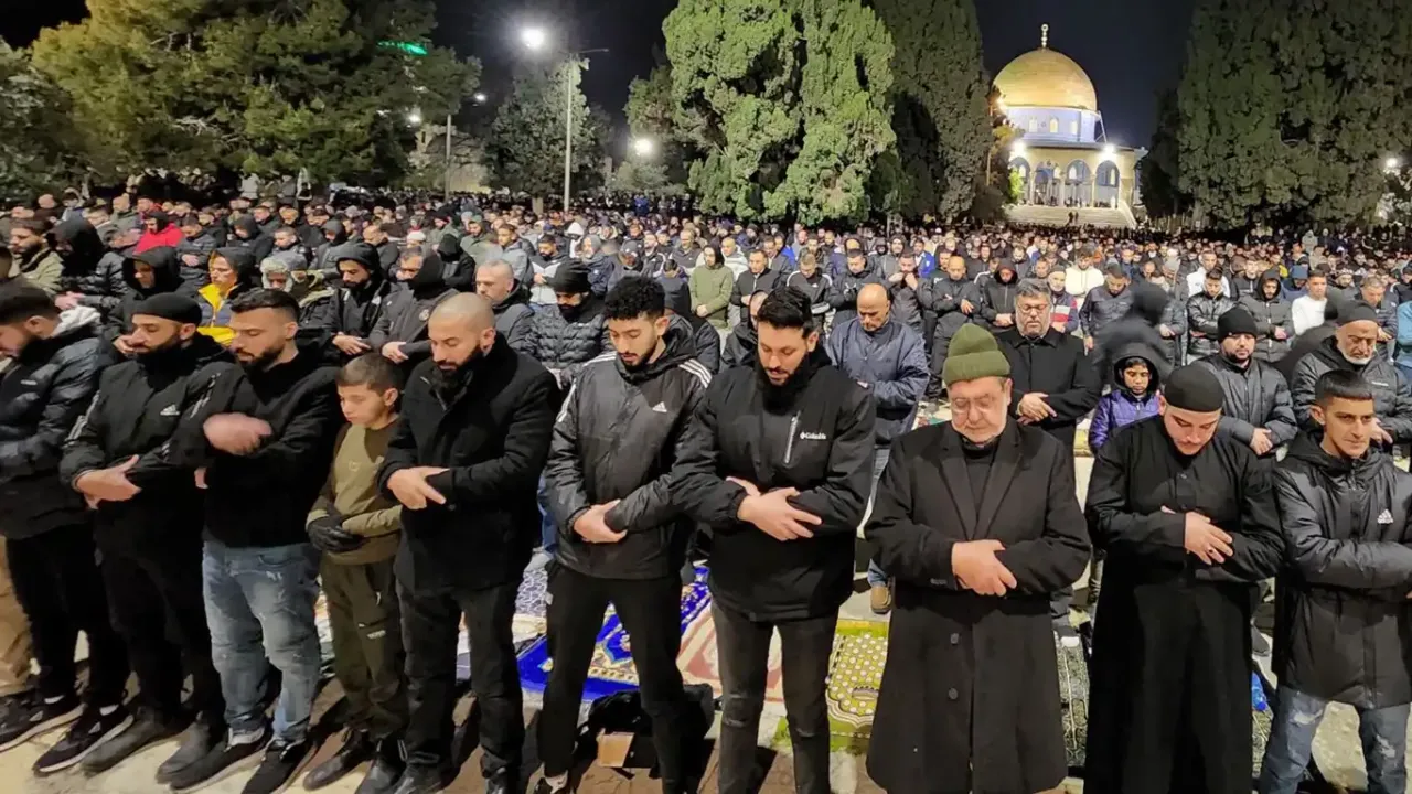 Kudüs'teki İslami Vakıflar Dairesi, "İşgalin kısıtlamalarına rağmen yaklaşık 35 bin Filistinli Mescid-i Aksa'da akşam ve teravih namazlarını kıldı." açıklamasına yaptı.