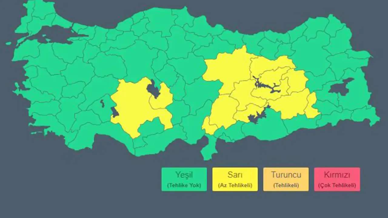 Meteoroloji'nin sarı kodla uyardığı iller şunlar; Adıyaman, Bingöl, Diyarbakır, Elazığ, Erzincan, Konya, Malatya, K.Maraş, Sivas, Tunceli, Aksaray, Batman ve Osmaniye.