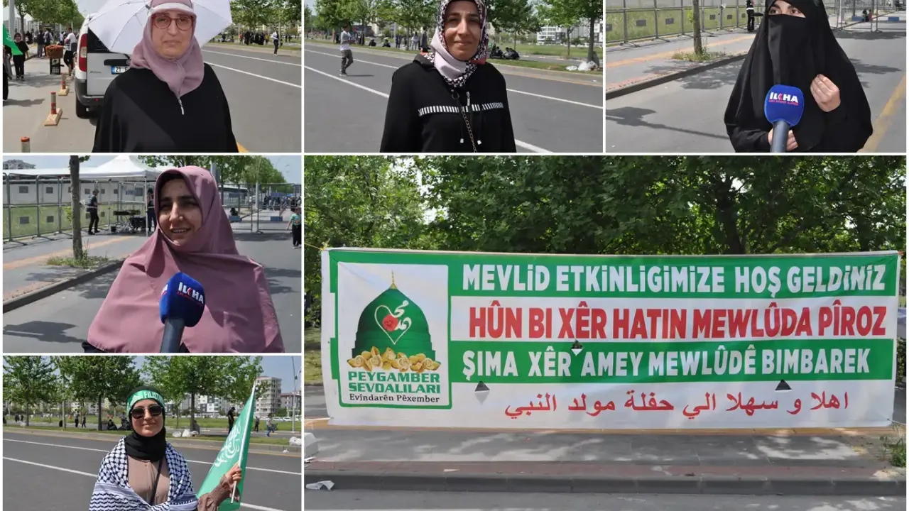 Peygamber sevdalılarının tekbir ve salavatlarla akın ettiği Newroz miting alanında "Cihad Önderi Hazreti Muhammed" temalı Mevlid-i Nebi etkinliği büyük bir coşku ile kutlanırken Türkiye'nin birçok şehrinden gelen bayanlar, Müslüman ülkelerine Filistin'e, Gazze'ye destek olmaları çağrısında bulundu.