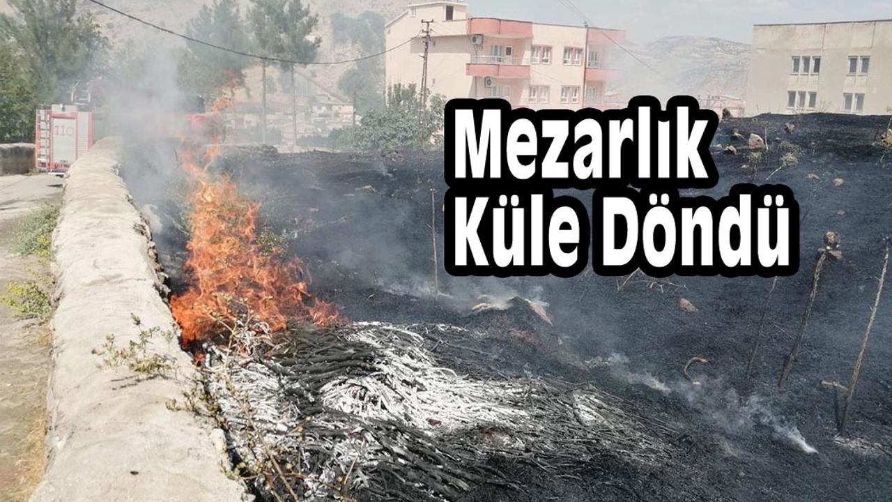 mezarlıkta çıkan yangın, bütün alanı küle çevirdi. Alanda bulunan ağaçlar da