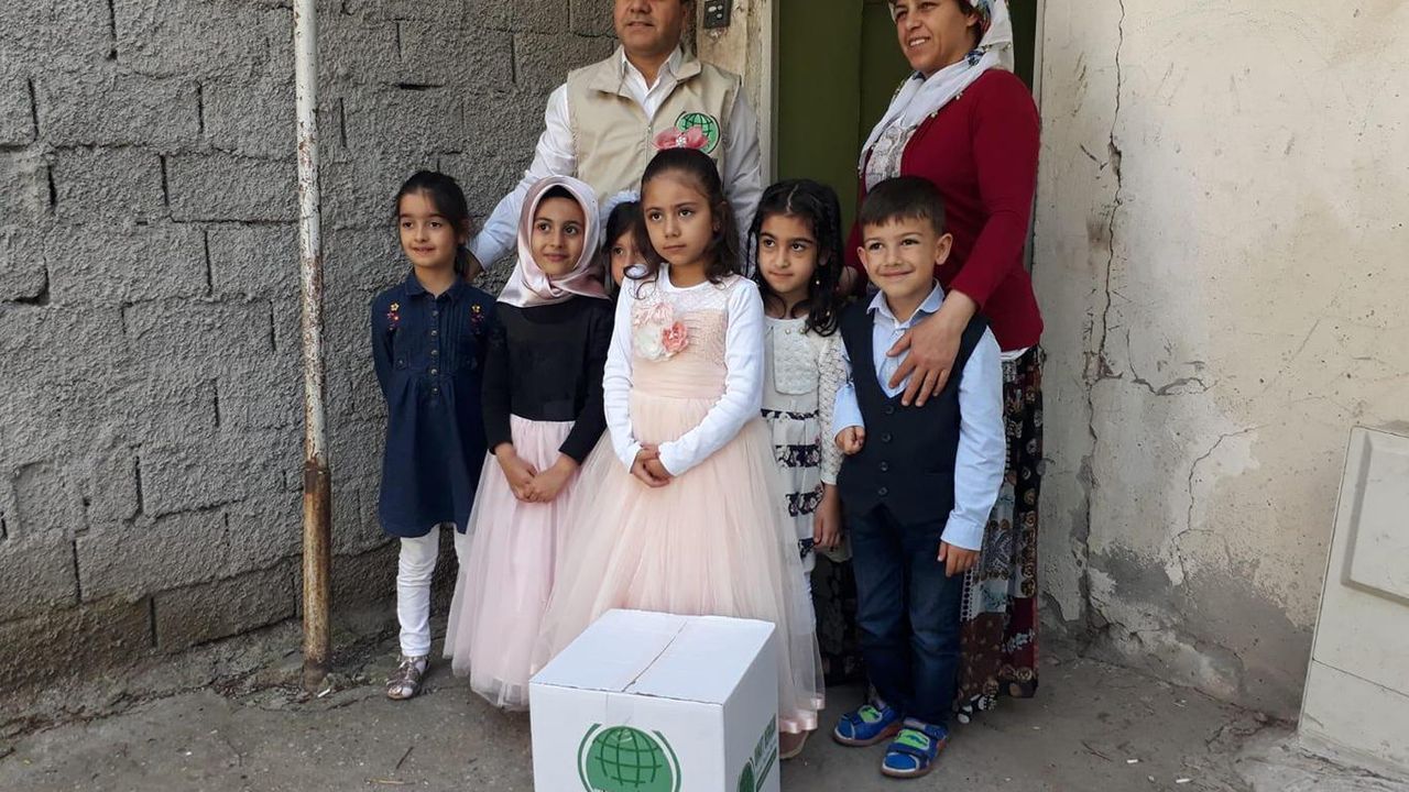 Batman Umut Kervanı Başkanı M. Ali Işık, çocuklarla birlikte gittikleri muhtaç bir aileye gıda kolisini verdi.