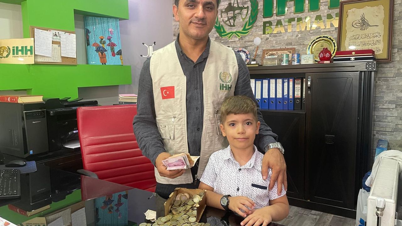 Merkezde ikamet eden Hüseyin Önder, babasıyla birlikte geldiği Batman İHH Derneği'nde, kumbarasında topladığı tam 2.750 TL'yi Gazze'ye ulaştırılmak üzere İHH Başkanı Mehmet Latif Kaya'ya teslim etti.