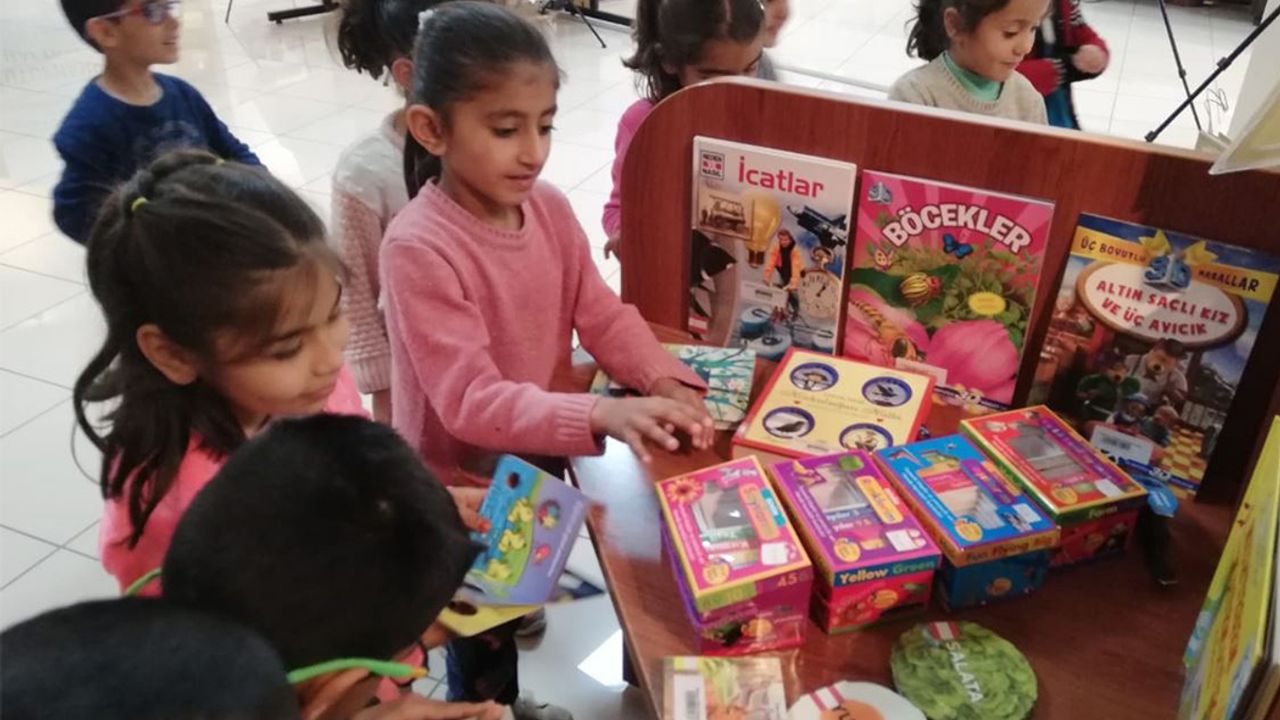 Köyünden sergiye getirilen minik köy öğrencileri kitapları sevdi. Kitapları