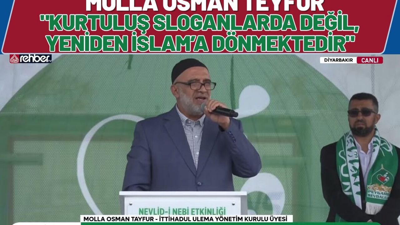 Peygamber Sevdalıları Vakfı’nın Diyarbakır Nevruz Parkı’nda düzenlediği ve mahşeri bir kalabalığa ev sahipliği yapan Mevlid-i Nebi etkinliğinde, Batmanlı alim ve İTTİHADUL ULEMA üyesi Molla Osman Teyfur, Kürtçe gerçekleştirdiği hitabında ümmetin kanayan yaralarına parmak bastı. Teyfur, İslam dünyasının içine düştüğü tefrikanın sadece siyasi bir zayıflık değil, aynı zamanda manevi bir azap olduğunu vurgulayarak, kurtuluşun ancak Kur’an ve Sünnet’e "kayıtsız şartsız" dönüşle mümkün olacağını ifade etti.