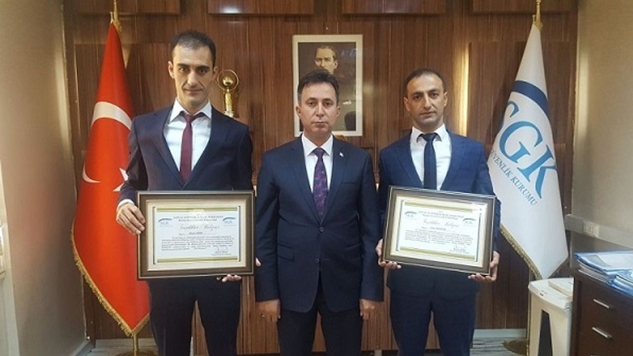 SGK'dan yapılan açıklamada, 'Kurum personellerinden, Memur Emin CİHANGİR ve V.H.K.İ Ahmet AYDIN'a Kurum içerisinde göstermiş oldukları başarılı çalışmaları ayrıca vatandaşlarla, personellerle ve amirleriyle olan ilişkilerindeki olumlu davranışları nedeniyle, gerek iş ahlakları gerekse görevi sırasında üstün hizmetleri dolayısıyla İl Müdürü Alaettin ÖKTEN tarafından, kendilerine Teşekkür Belgesi takdim edilmiştir.' denildi.