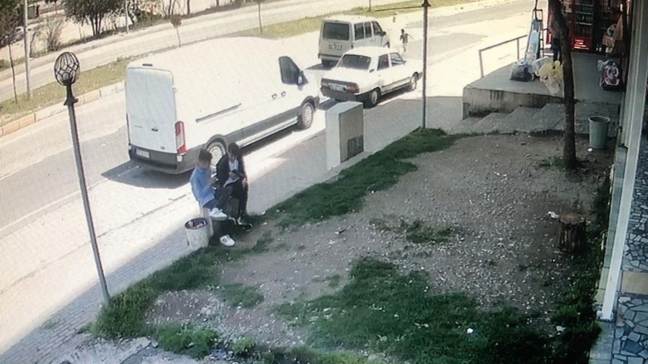 Yiğit Efe, daha sonra kalkıp koşarak kaldırımda oturdu. Sürücü, aracından