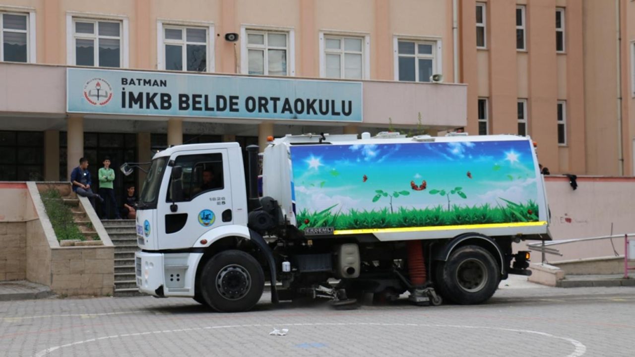 Belediyemiz Temizlik İşleri Müdürlüğü bünyesinde hizmet veren yol süpürme aracı yardımıyla okullarda bahçe temizliği yapan ekiplerimiz, okul personelinin saatlerce temizleyemediği bahçeyi çeyrek saat dilimi içerisinde temizliyor.Özellikle öğrencilerin teneffüste olduğu saat diliminde çalışma gerçekleştiren ekiplerimiz, öğrencilerin zarar görmemesi için büyük çaba sarf ediyor.Yapılan çalışmalardan memnun kalan okul yönetimi, öğrenci ve velileri : 'Belediyemiz Batman'da başlattığı, mahalle temizliği, çevre temizliğini şimdi de okullarımıza yansıttı. Hayatımızın her alanında temizliğin önemi büyüktür. Başlatılan temizlik kampanyasına bizler de destek veriyoruz. Çevrenin kirletilmemesi için öğrencilerimizi sık sık uyarıyoruz' ifadelerinde bulundular. Şevki Aslan