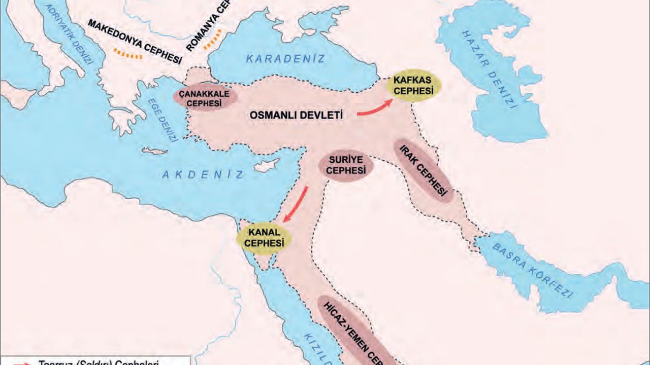 Hicaz-Yemen Cephesi: Osmanlı'nın kutsal toprakları ve Ortadoğu'daki petrol yataklarını korumak amacıyla İngiliz destekli Arap isyanlarına karşı savaştığı cephedir.