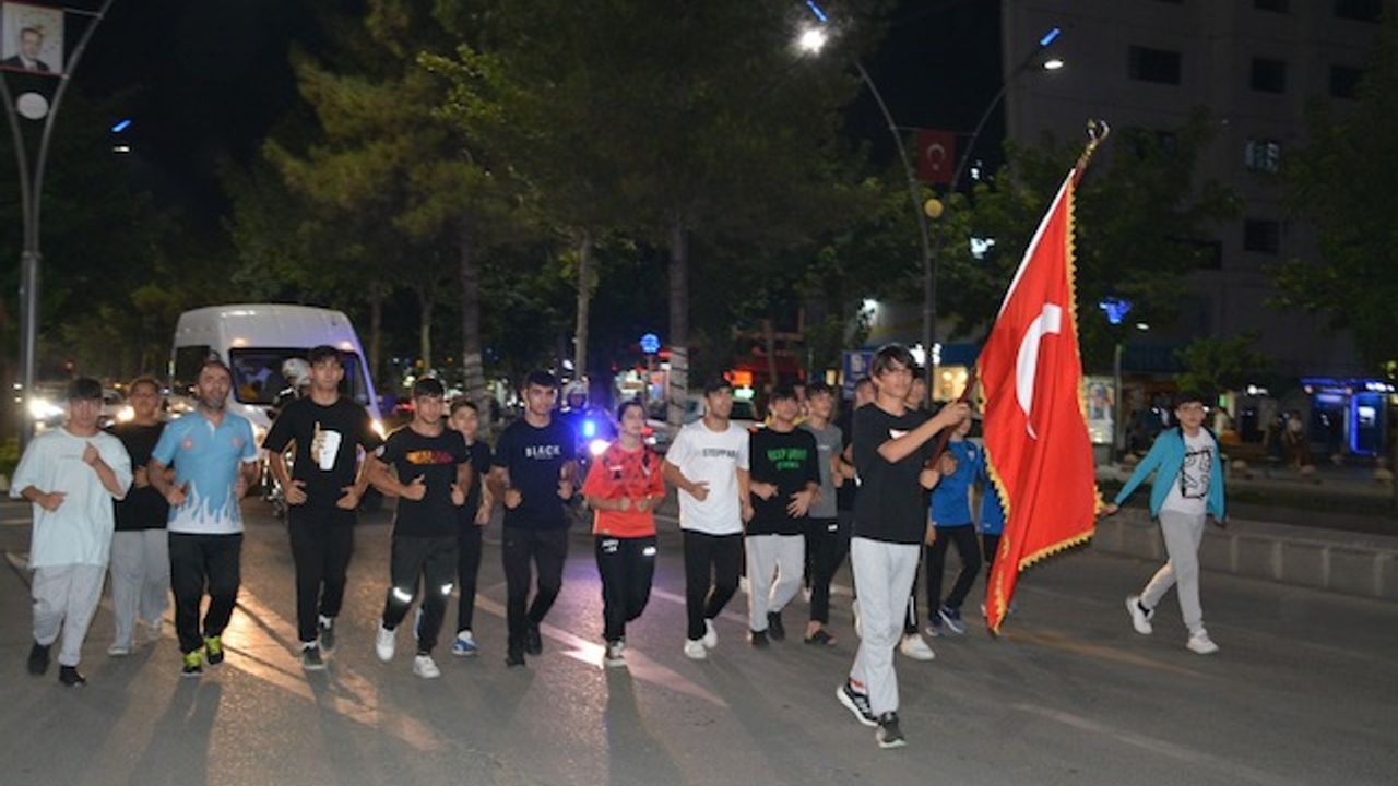 Batman Gençlik ve Spor İl Müdürü Mehmet Şafi Özperk ile sporcular, 15 Temmuz Demokrasi ve Milli Birlik Günü' dolayısıyla elden ele koşarak etkinlik alanına getirilen sancağı Vali Ekrem Canalp’a teslim ettiler.