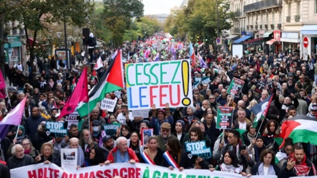 Fransa'nın başkenti Paris'te yağmura rağmen Gazze'de "ateşkes" yapılmasını isteyen göstericiler, sokağa inildi.