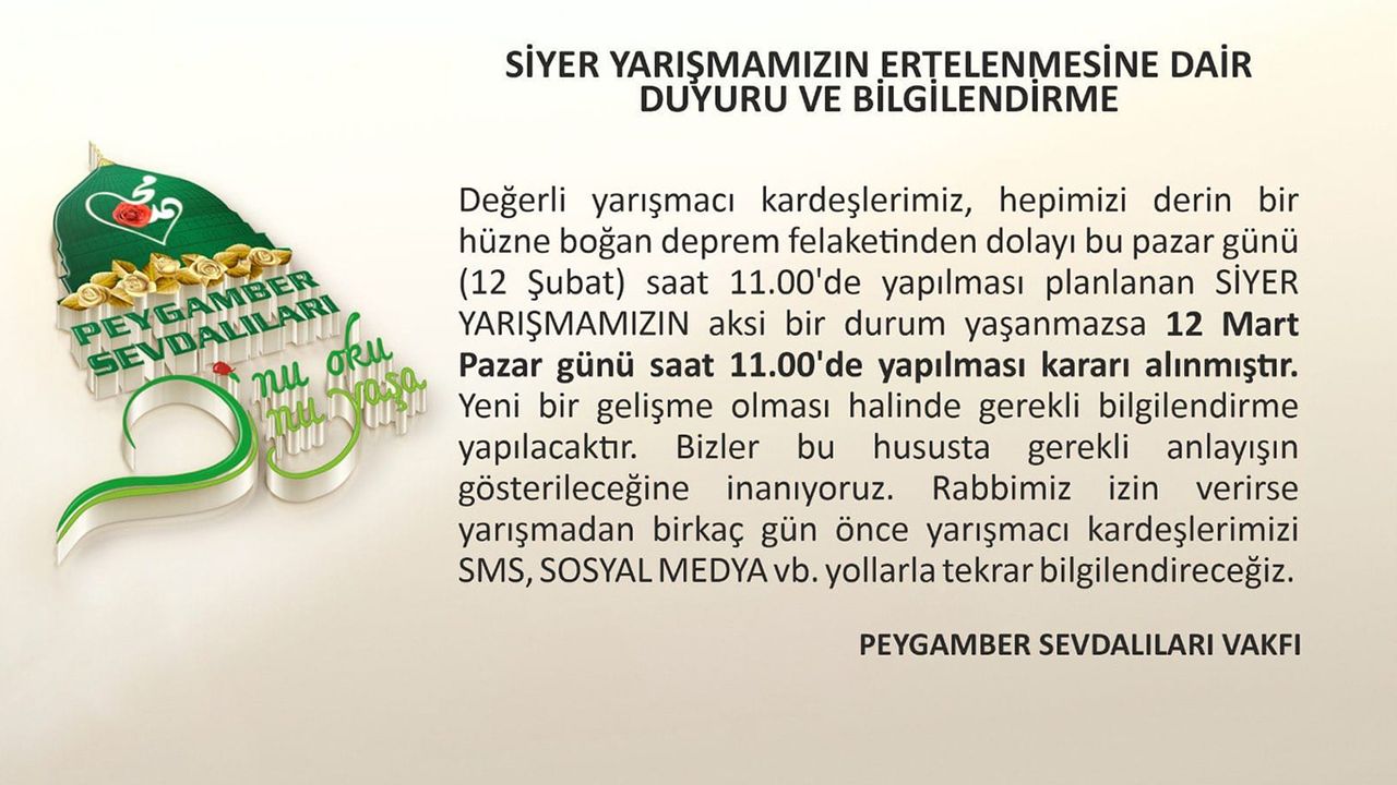 Siyer Yarışması'nın ertelenmesine yönelik bilgilendirmelerde bulunan Vakıf, "Değerli yarışmacı kardeşlerimiz, hepimizi derin bir hüzne boğan deprem felaketinden dolayı bu pazar günü 12 Şubat saat 11.00’de yapılması planlanan Siyer Yarışmamızın aksi bir durum yaşanmazsa 12 Mart Pazar günü saat 11.00’de yapılması kararı alınmıştır." dedi.