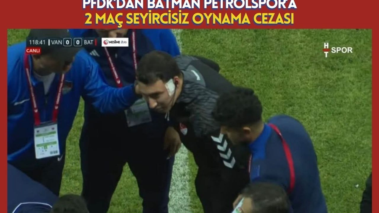Profesyonel Futbol Disiplin Kurulu (PFDK), 1 Haziran 2025 tarihinde oynanan Nesine 2. Lig Play-Off mücadelesinde yaşanan saha olayları nedeniyle Batman Petrolspor’a ağır cezalar verdi. Van’da oynanan karşılaşmada taraftarlarının neden olduğu olaylar sonrası Petrolspor, iki resmi müsabakayı deplasmanda seyircisiz oynama cezası aldı.