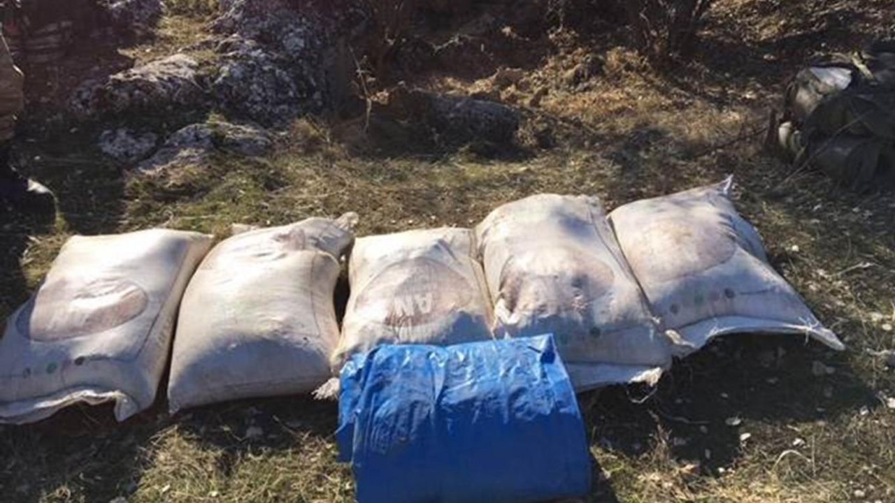 Açıklamada, mağaralar ve bidon içerisinde yapılan incelemede; 20 kilogram teneke içerisinde amonyum nitrat ile güçlendirilmiş patlamaya hazır EYP düzeneği, 20 kilogram benzinle güçlendirilmiş amonyum nitrat, 346 kilogram amonyum nitrat, 8 büyük pilden oluşturulmuş EYP düzeneği, koli bandına sarılmış EYP düzeneği, EYP için anahtar sistemi, 500 gram kutu içerisinde elektrikli fünye, 4 adet 120 metre uzunluğunda kablo, 3 adet 8'li pil bloğu, 10'lu pil bloğu, 2 adet 4'lü pil bloğu, 3 adet koli bandı ile sarılı büyük pil, pil şarj aleti, el telsizi anteni, yaeusi marka el telsizi, 30x30 santim ebadında güneş paneli, 9 litre benzin, bol miktarda yaşam ve giyim malzemeleri ele geçirildiği kaydedildi.
