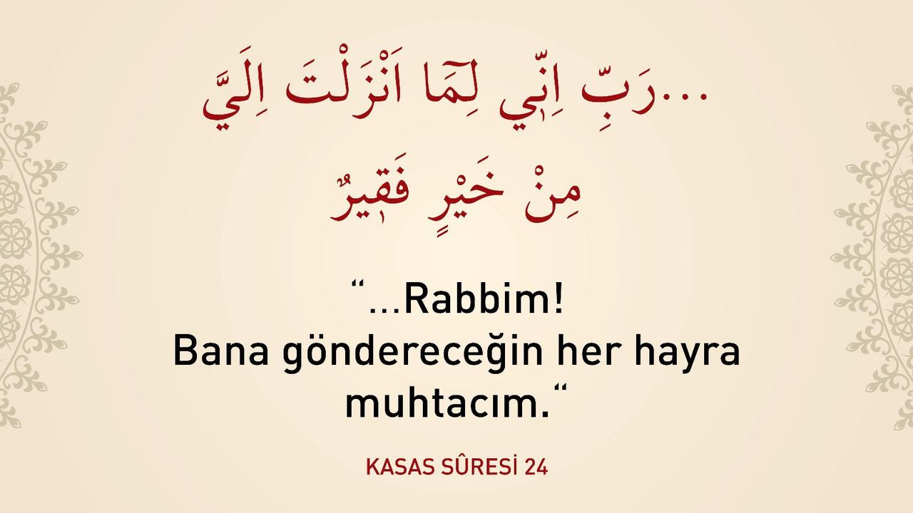 Bu dua, Hz. Musa'nın Mısır'dan kaçıp Medyen'e sığındığı, yalnız, yorgun ve muhtaç bir durumda olduğu sırada Allah'a yönelerek ettiği bir yakarıştır. Hiç kimsesi olmayan, kalacak bir yeri bile bulunmayan Hz. Musa, bu duayla Allah'tan her türlü hayrı dilemiş ve O'na olan sonsuz ihtiyacını dile getirmiştir. Bu duanın ardından, Hz. Musa hem kalacak bir yer bulmuş hem de kendisi için hayırlı bir eş ve iş sahibi olmuştur.