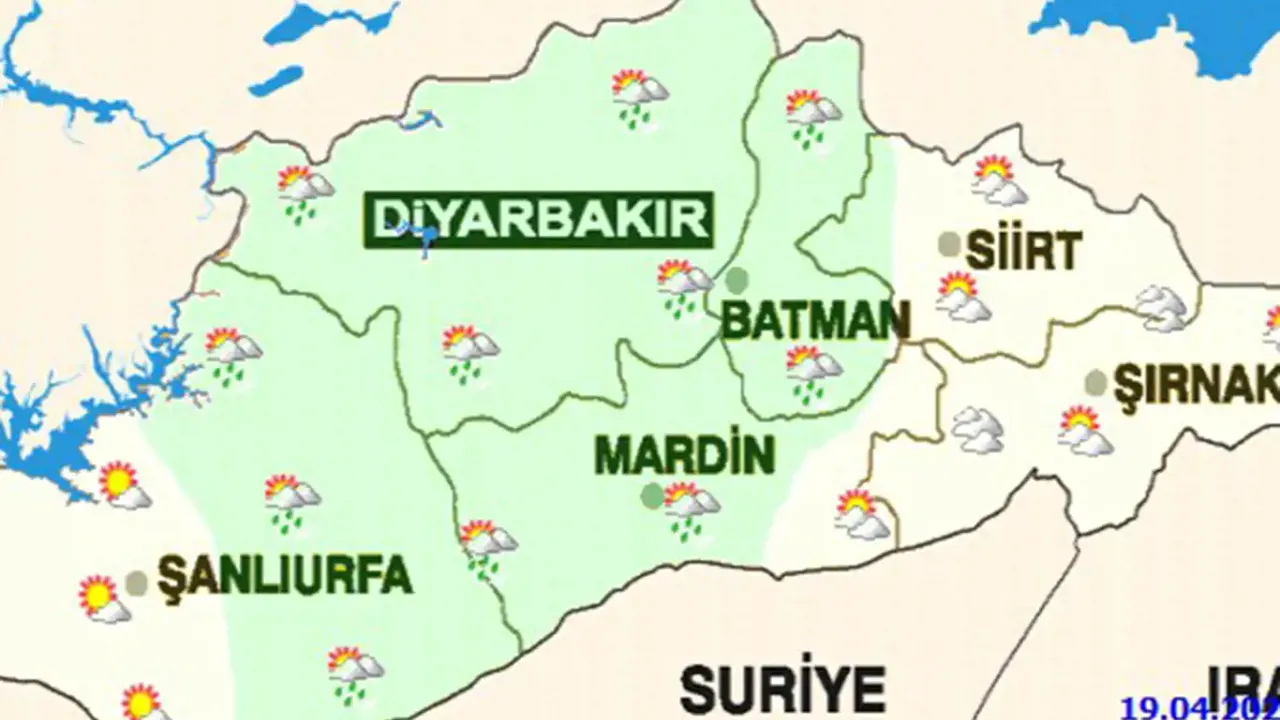 "Bayramın birinci günü Diyarbakır’ın kuzey ve doğusu, Batman ve Şırnak çevrelerinde yerel olmak üzere sağanak ve yer yer gök gürültülü sağanak yağışlı geçeceği, diğer yerlerin parçalı bulutlu geçeceği tahmin ediliyor. Bayramın 2'nci günü Siirt çevrelerinde yerel olmak üzere sağanak ve yer yer gök gürültülü sağanak yağışlı geçeceği, diğer yerlerin parçalı ve çok bulutlu geçeceği tahmin ediliyor. Bayramın 3'üncü günü bölgemizin kuzey kesimlerinde yerel olmak üzere sağanak ve yer yer gök gürültülü sağanak yağışlı geçeceği, diğer yerlerin parçalı ve çok bulutlu olacağı tahmin ediliyor." (İLKHA)