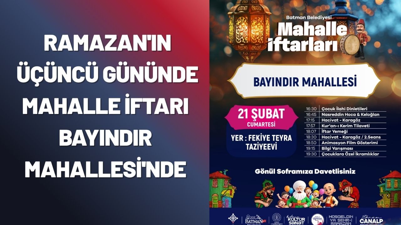 Batman Belediyesi'nin Ramazan ayı dolayısıyla kentin farklı noktalarında organize ettiği mahalle iftarları programı sürüyor. Programın bugünkü (21 Şubat Cumartesi) durağı Bayındır Mahallesi olacak.
