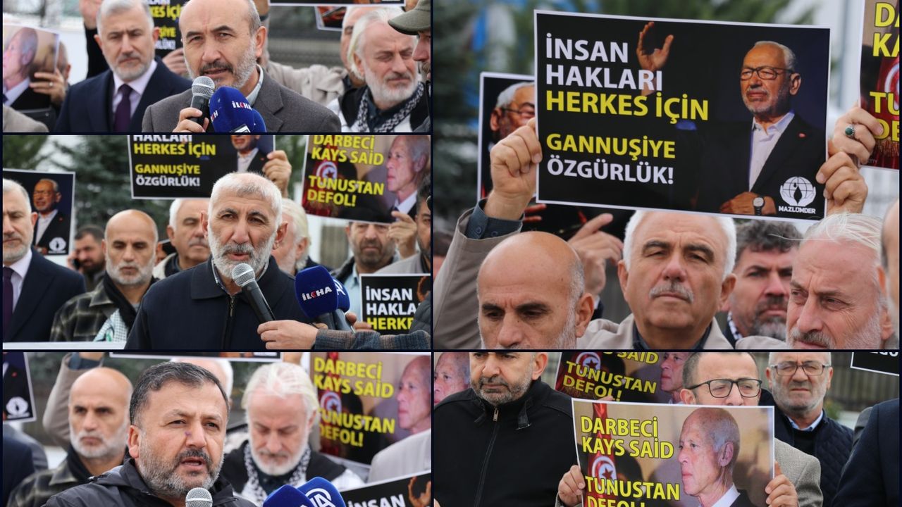 Cezaevinde açlık grevine başlayan Gannuşi’nin derhal ve koşulsuz olarak serbest bırakılması için insanlık, adalet ve vicdan çağrısında bulunmak amacıyla MAZLUMDER öncülüğünde Ankara’daki STK temsilcileri Tunus Büyükelçiliği önünde toplandı.