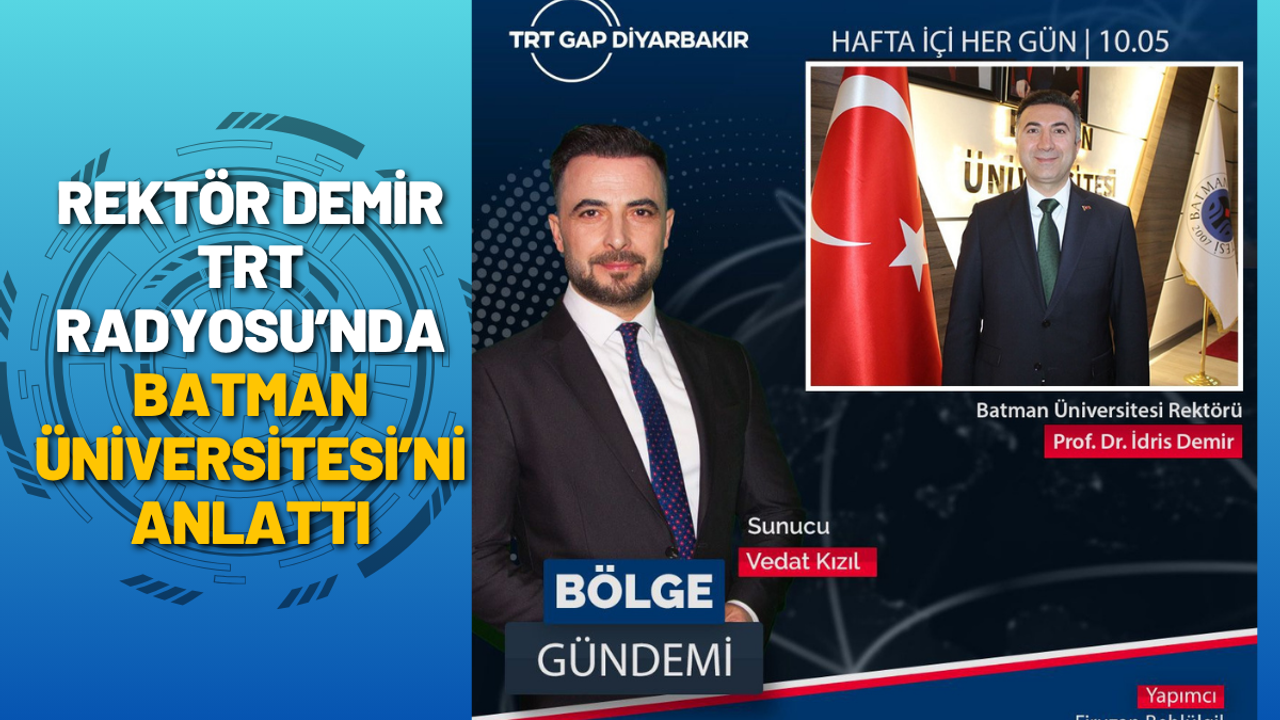 Batman Üniversitesi Rektörü Prof. Dr. İdris Demir, TRT GAP Radyosu'na konuk olarak, üniversite tercihi yapacak öğrenciler için Batman Üniversitesi'nin sunduğu eğitim-öğretim olanaklarını, fiziki altyapısını, akademik başarılarını ve gelecek hedeflerini kapsamlı bir şekilde anlattı. Rektör Demir, üniversitenin "Bilgiyi Enerjiye Dönüştüren Üniversite" mottosuyla öne çıktığını vurguladı.