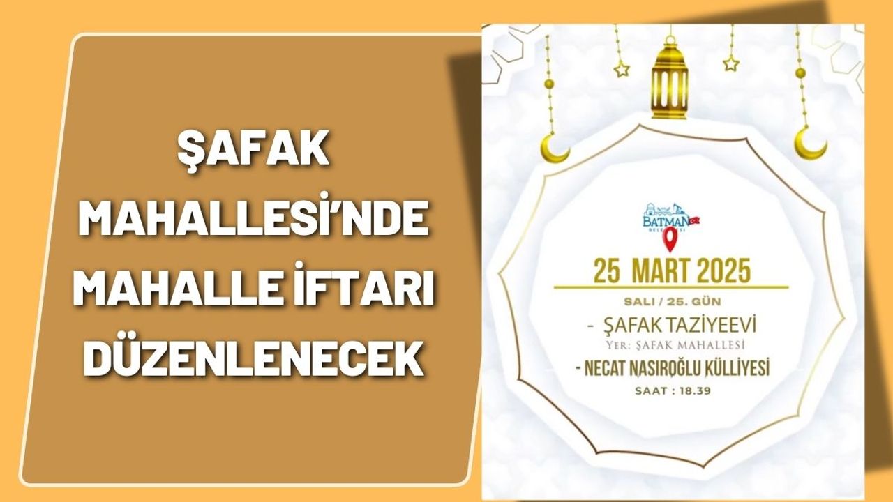 Batman Belediyesi, Ramazan ayının bereketini ve birlik ruhunu paylaşmak amacıyla mahalle iftarları düzenlemeye devam ediyor. Bu kapsamda, Şafak Taziyeevi’nde iftar programı düzenlenecek. Belediyeden yapılan açıklamada, saat 18:39’da başlayacak iftar organizasyonuna tüm vatandaşların davetli olduğu belirtildi.