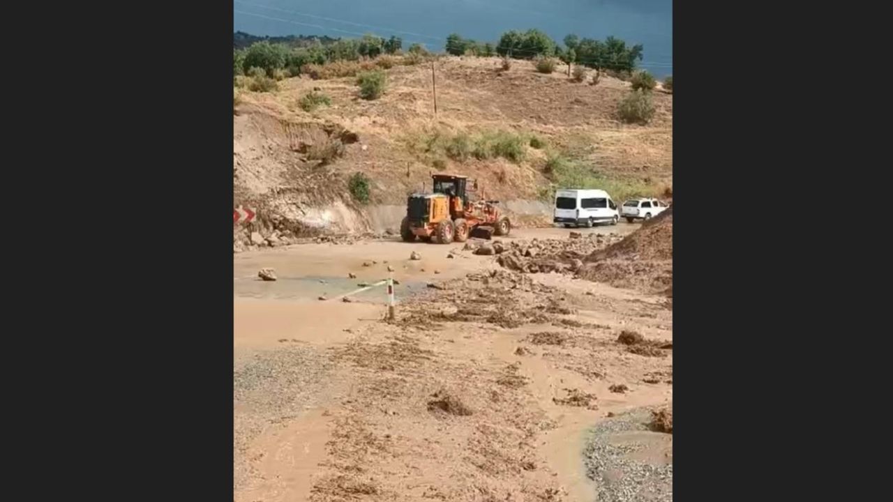 mevkiinde şiddetli yağış dağlardan sürüklediği çamur ve kayaları yola