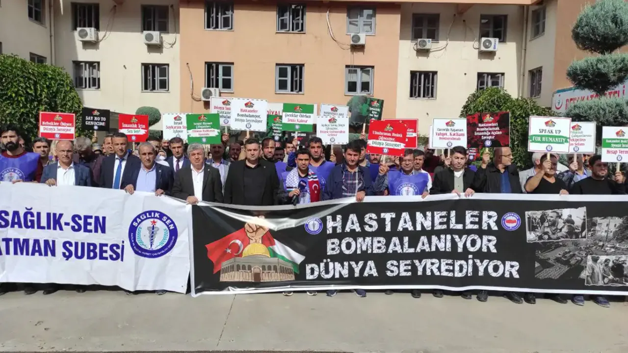 Eğitim ve Araştırma Hastanesi önünde düzenlenen basın açıklamasını okuyan Sağlık-Sen Batman Şube Başkanı Halil İbrahim Dursun, Gazze'de savaş suçunun işlendiğini söyledi.