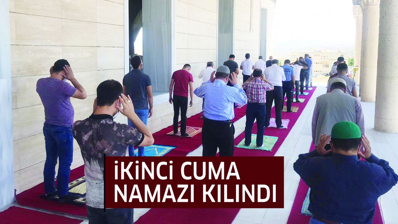 Cami avlusunda açık havada seccadelerini sosyal mesafe kuralına uygun şekilde