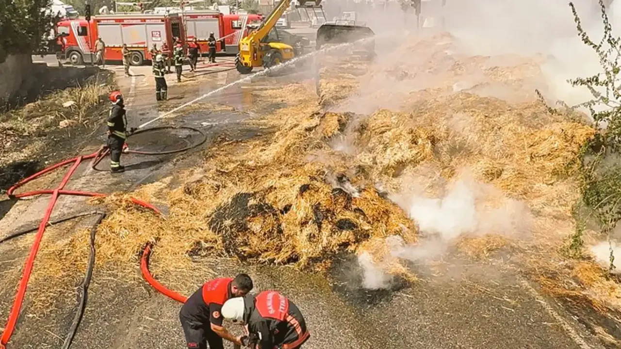 Edinilen bilgilere göre, saman yüklü tır, henüz belirlenemeyen bir sebepten dolayı alev aldı.