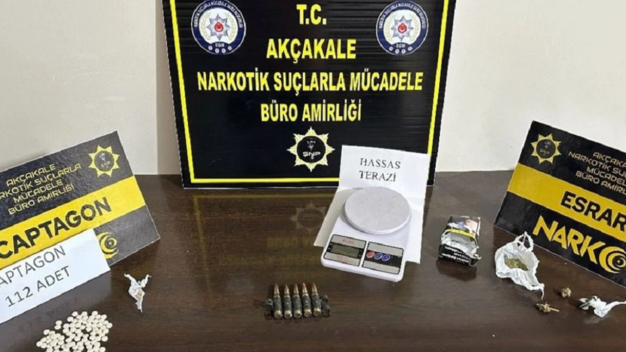 Bu kapsamda bir iş yerinden çıkış yaptığı sırada durumundan şüphelenilerek durdurulan H.Ö'nün üstünde, iş yeri ve evinde yapılan aramalarda bir miktar uyuşturucu, 112 uyuşturucu hap, hassas terazi, 5 uzun namlulu silah fişeği ele geçirildi.