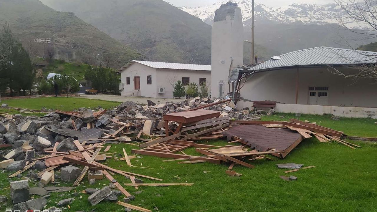 rüzgâr nedeniyle Sason'un Yolüstü Köyü Camii'nin minaresi ve çatısı yıkıldı,