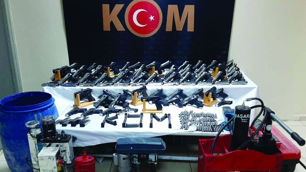Açıklamada, bir araç ve atölyeye dönüştürülmüş depoda yapılan aramada; 126 ruhsatsız tabanca, 162 sarjör, 18 farklı ebatlarda fişek, 80 ağzı açık namlu, 16 silah gövdesi, 17 sürgü, 62 soğuk kaynak yapıştırıcı, 36 kabza plastiği, bir pres makinası, bir mengene takılı tezgah, bir matkap tezgahı ve makinası, 2 kumpas, 2 taşlama makinası, 2 spiral makinası, bir matkap ve çok sayıda silah parçaları (emniyet pimi, icra yayı, mandal vs.) ele geçirildiği ifade edildi.