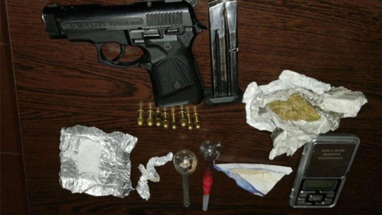 Yapılan açıklamada, " Park halindeki bir araçta bulunan 3 şahsın yapılan G.B.T. kontrollerinde İ.İ. isimli şahsın 6 farklı suçtan arandığı ve 5 yıl 4 ay kesinleşmiş hapis cezasının bulunduğu, D.G. isimli şahsın ise 4 ayrı suçtan aranması bulunduğu tespit edilmiş olup, aracın görünür yerlerinde de, 1 adet ruhsatsız tabanca, 8 adet 7,65 çapında fişek, 7,23 gram esrar maddesi, 0,91 gram eroin maddesi, 1,47 gram taş eroin, 3,47 gram metamfetamin ele geçirilmiştir. Yakalanarak gözaltına alınan şahıslar Narkotik Şube Müdürlüğüne teslim edilmiştir" denildi. Haber Merkezi