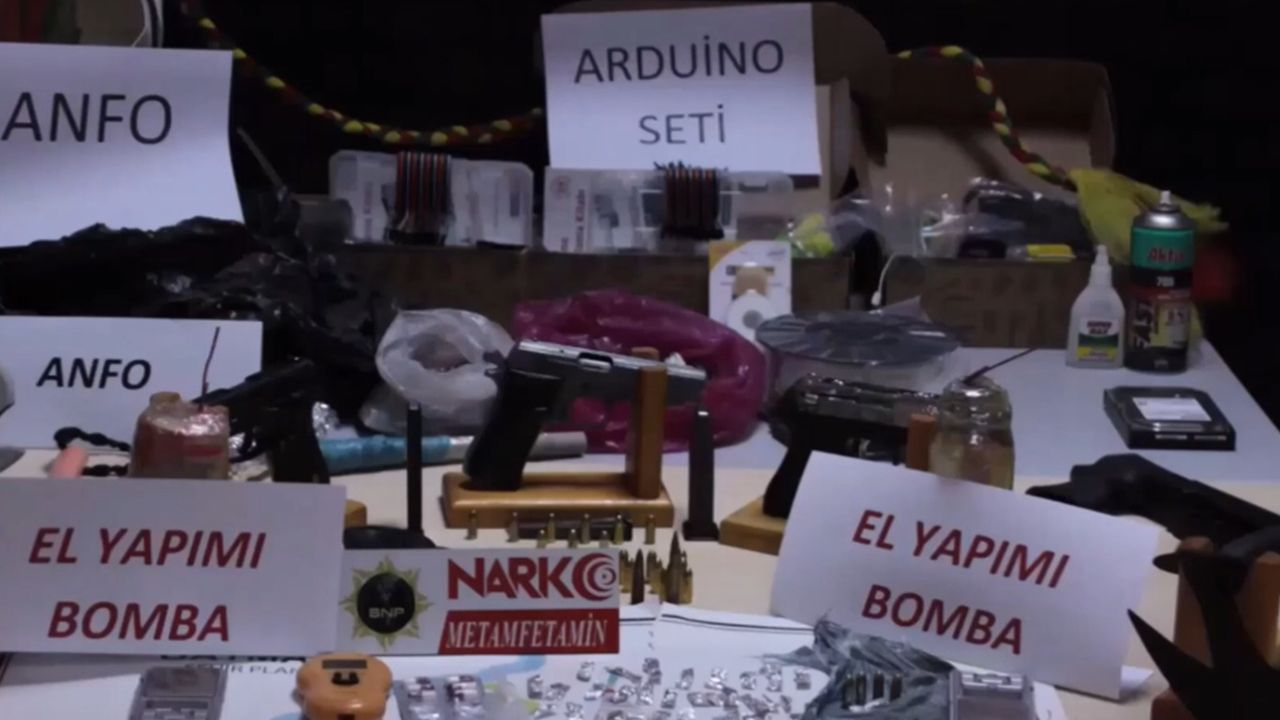 Vali açıklamasının devamında, “Yapılan operasyonda şüphelilere ait ikamet ve işyerlerinde yapılan aramalarda, “3 parça tesirli el yapımı bomba, çok sayıda el yapımı patlayıcı yapımında kullanılan elektronik devre ve devre elemanları, el yapımı bomba yapımında kullanılan 2 kilo 731 gram ağırlığında kahve renkli iri ve ufak taneli anfo diye tabir edilen madde, el yapımı bomba yapımında kullanıldığı değerlendirilen toplam ağırlığı 312,6 gr olan 25 torpil, el yapımı bomba yapımında kullanıldığı değerlendirilen 212,1 gram ağırlığında gri renkli toz madde, El yapımı bomba yapımında kullanıldığı değerlendirilen granül halde toplam ağırlığı 319,5 grsm gelen beyaz renkli ufak tanecikli kimyevi gübre olduğu değerlendirilen madde 13 ruhsatsız tabanca, 129 mermi, 2 balta, 2 pala, 1 ucuna neşter ve çivi takılmış sopa fişek olarak tabir edilen satışa hazır vaziyette 72 parça metamfetamin maddesi, 9 parça sentetik kannobinoid maddesi, 3 parça esrar maddesi, 77 uyuşturucu hap, 4 uyuşturucu madde tartımında kullanılan hassas terazi ele geçirilmiştir.” dedi.ŞEVKİ ASLAN